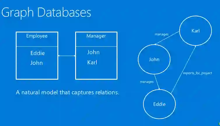 举个例子,左边是一个表,右边是和它等价的图中的关系。我们可以看到这里有三个人,有老板,也有员工。老板会管理员工,员工也会为了某个项目向老板报告,这种数据模型最核心的数据结构就是图。