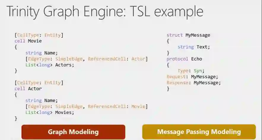 这里有两个TSL的例子,可以看到TSL和C族语言非常像。首先,看一下图模型的定义,我们用Cell关键字,指明定义的结构体是一种实体——实际上一个cell就是一个Key对应的一个Value,它有自己的内部结构。比如Movie里有电影名字,主演等。同样的,根据演员名字,我们可以得出这个人演了哪些电影。