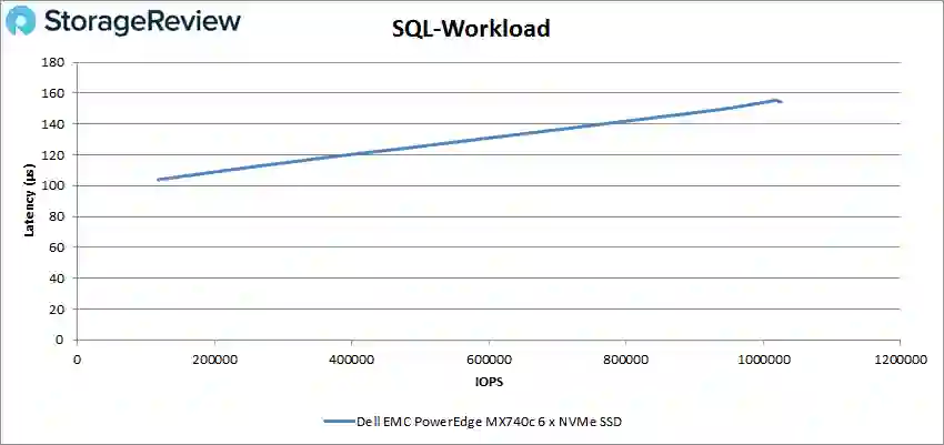 对于 SQL,MX 的启动速度为 117,778 IOPS,延迟为 104 微秒;峰值速度为 1,023,439 IOPS,延迟为 154.9 微秒。