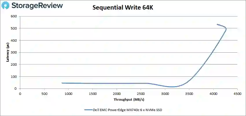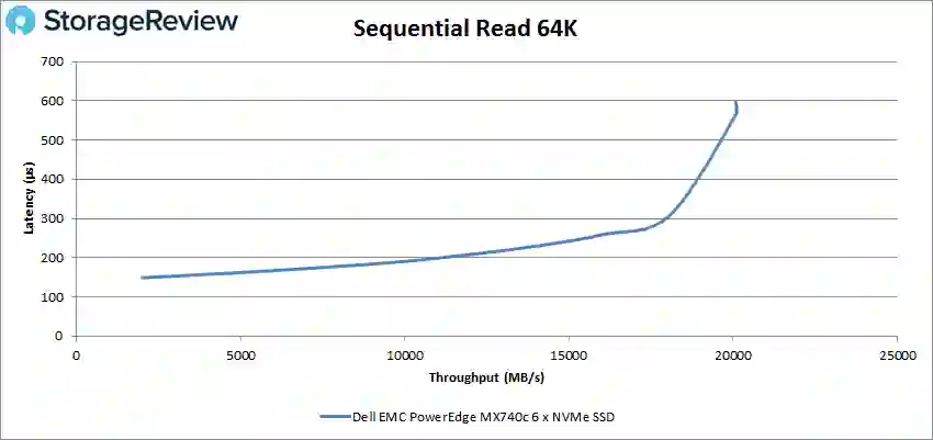 对于 64K 顺序读,MX 开始速度为 32,114 IOPS 或 2.01GB/s,延迟为 149 微秒,并在一个轻微下降之前,以 563 微秒的延迟达到大约 321K IOPS 或 20.1GB/s 的峰值。