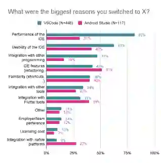 如下图所示,开发人员之所以改用 VS Code 主要原因包括:性能(82%)和可用性(63%)。另一方面,用户切换到 Android Studio 主要是因为:功能(51%)、与 Flutter 工具的集成(39%)、与原生平台的集(27%)。