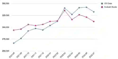 图:2021 年 8 月~2022 年 7 月两款 IDE 的 Flutter 开发人员数量,可以看出在最近几个月内 VS Code 的流行度超过了 Android Studio。