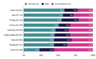 通过调查,我们还发现来自不同国家或地区的 Flutter 开发人员喜欢的 IDE 也不同。虽然大多数 Flutter 开发人员更喜欢 VS Code,但中国的开发人员更喜欢 Android Studio(56%),喜欢 VS Code 的开发人员只有 23%。
