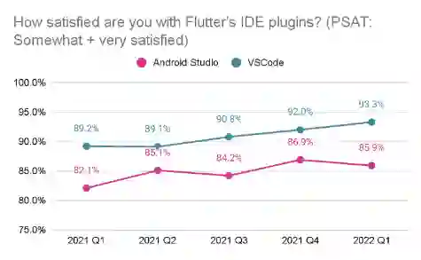 图:93.3% 的 VS Code 用户表示很满意对 Flutter 的支持,而只有 85.9% 的 Android Studio 用户感到满意。