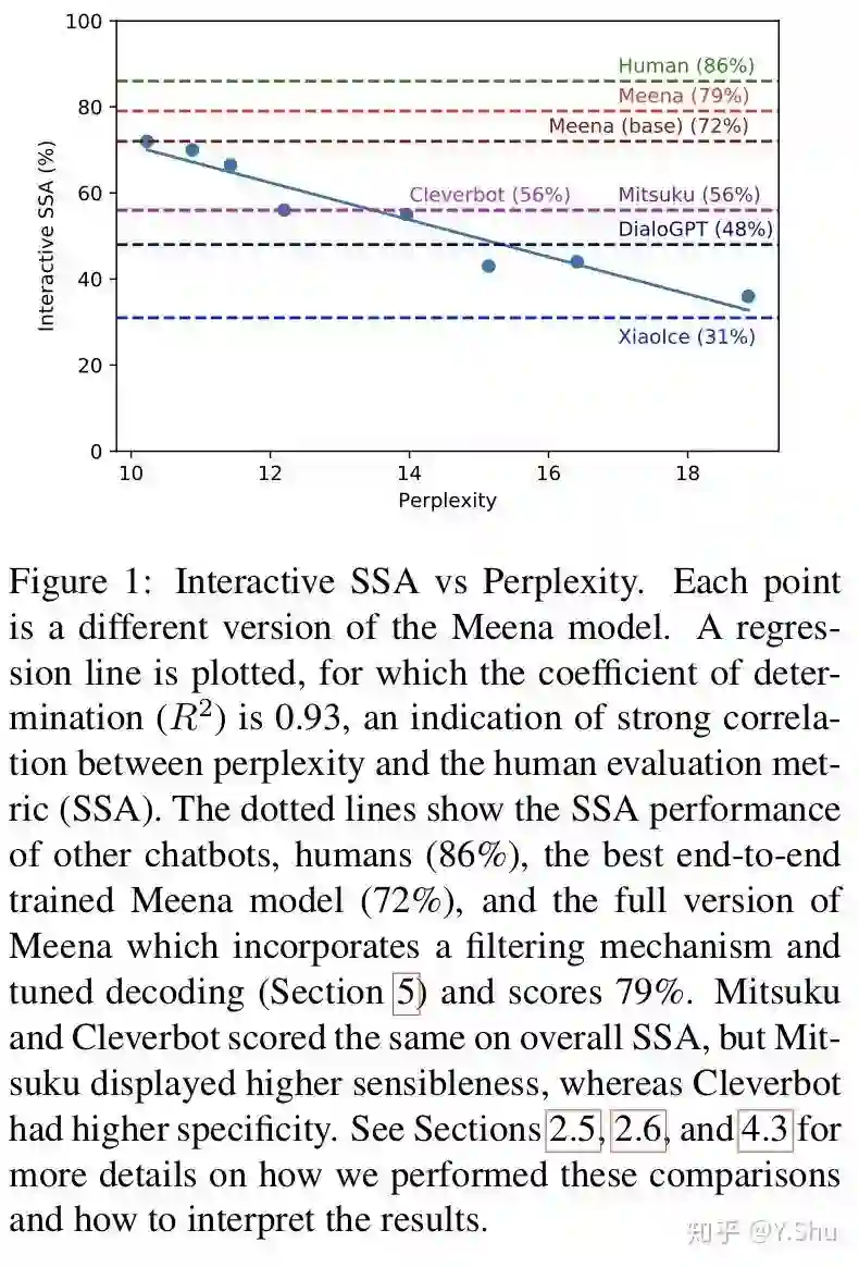 作者感到惊讶但高兴的是,无论是在静态评估还是互动评估中,SSA指标都与Meena的困惑紧密相关。换句话说,Meena越适合其训练数据,其聊天响应就越敏感和具体。乍一看,这个结果看似直观,但它令我们惊讶,因为最近的研究发现,人类评估得分与BLEU等自动指标之间的关联性很差(Liu等人,2016;Lowe等人, 2017)。