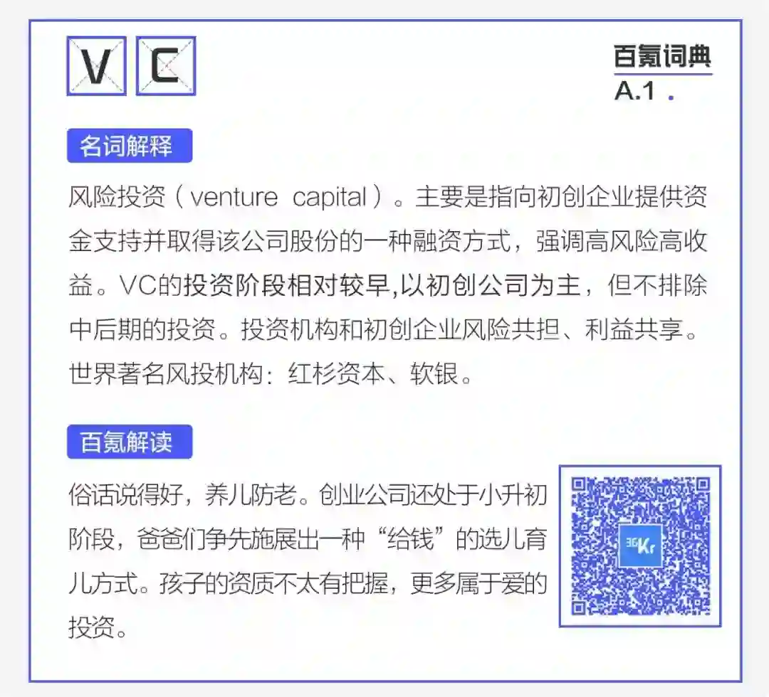 36氪「百氪词典」正式上线,用易懂的方式解读常用的互联网专业术语,丰富你的知识储备。今日解释词为「VC」,明日词语为「PE」。