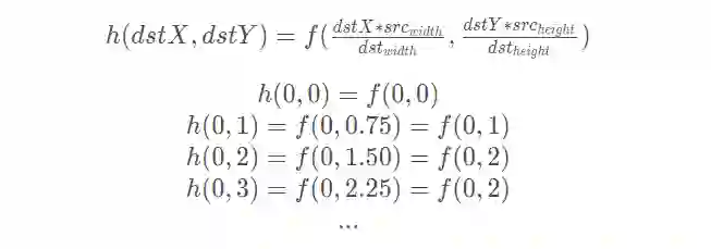 这种变换下,原图像的有些点没有参与计算。举个例子,把9∗9的原图像缩小成3∗3,原图像的原点(0,0)和目标图像的原点(0,0)都为左上角,目标图像右上角的坐标为(0,2),对应原图像的坐标为(0∗(9/3),2∗(9/3))=(0,6)。目标图像右边已经没有点了,(0,6)右边的像素点也就用不到了。