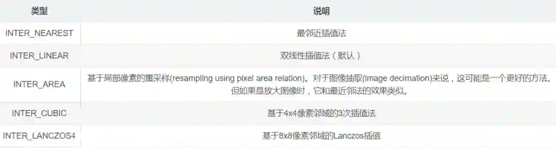 通常,缩小图像使用区域插值(cv.INTER_AREA),放大图像使用三次样条插值(cv.INTER_CUBIC)和双线性插值(cv.INTER_LINEAR)。三次样条插值方式速度较慢,双线性插值方式较快且效果也不错。