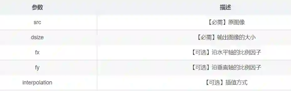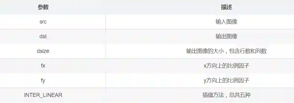 注:目标图像大小可以通过“参数dsize”和“参数fx和fy”两种方式确定。两种参数不能同时为0。