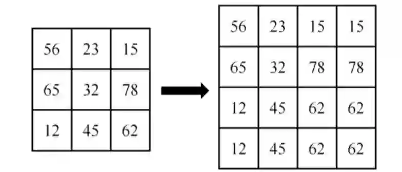 import cv2import numpy as npsrc = np.array([[56,23,15],[65,32,78],[12,45,62]],dtype=np.uint8)print(src)dst = cv2.resize(src,dsize=(4,4),interpolation=cv2.INTER_LINEAR)print(dst)