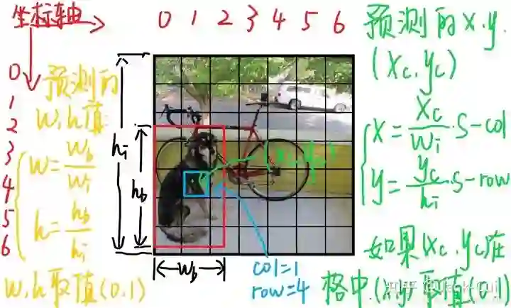 对于下图中蓝色框的那个单元格坐标为 ,假设它预测的输出是红色框的bbox,设bbox的中心坐标为 ,那么最终预测出来的 是经过归一化处理的,表示的是中心相对于单元格的offset,计算公式如下: