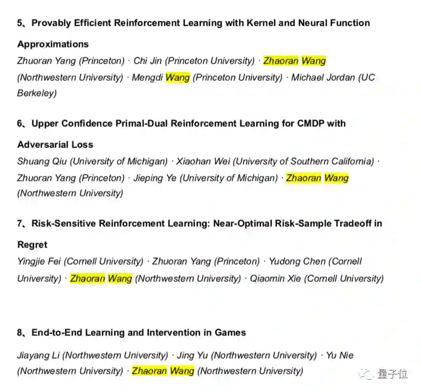 德克萨斯大学奥斯汀分校的汪张扬、普林斯顿大学的杨卓然则有8篇论文接收数。