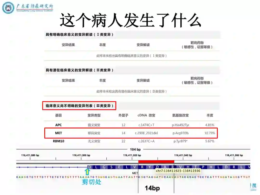 诊断:右上肺肉瘤样癌CT4N2M1a(胸膜) IVA期(第八版),MET 14exon 移码突变(NGS 丰度10.79%)。
