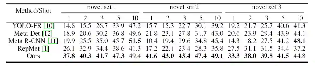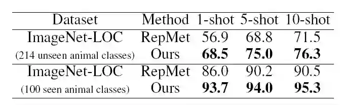 与 RepMet 和 Meta R-CNN 保持一致,研究员们分别在 ImageNet-LOC 和 Pascal VOC 上进行了实验,实验结果如下: