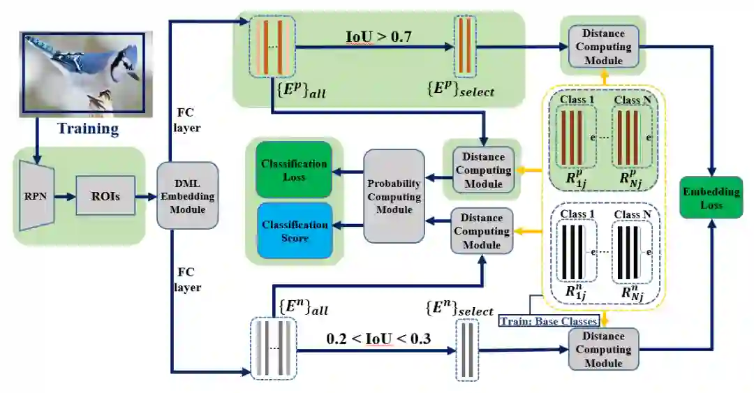 在样本丰富类别训练的过程中,RPN 和 DML Embedding Module 后通过两个全连接层分别对每个候选框提取正样本和负样本特征,并根据 IoU 对候选框进行正负样本分类。研究员们通过联合训练的方式,利用正样本候选框的特征训练其正样本表示(图6黄色虚线框),利用负样本候选框的特征训练其负样本表示(图6黄色虚线框)。然后,计算每个候选框的正样本特征与学习到的每个类别正样本表示的最小距离,计算每个候选框的负样本特征与学习到的每个类别负样本表示的最小距离。最后,综合利用这两个距离,并将距离通过概率度量模块转换为分类概率进行每个候选框的分类。