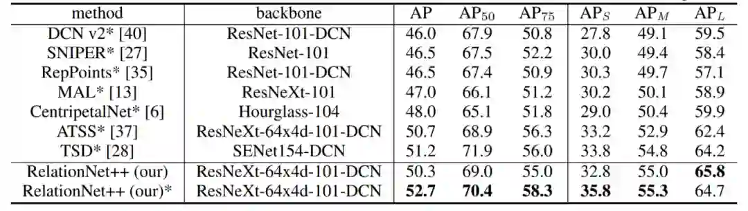 最后,将 BVR 模块插入到 ATSS 中时,该模型被称之为 RelationNet++,在 COCO test-dev 集合上达到了 52.7 AP 的性能,如表1所示。
