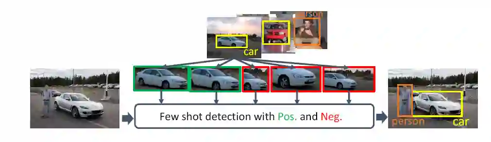 由于小样本类别上的样本极其有限,所以如何充分利用有限的样本信息就成为了小样本目标检测性能提升的关键。现有的小样本目标检测工作(Meta R-CNN [2]、RepMet [3]等)是在样本丰富类别上训练主干网络或嵌入表示网络,然后通过小样本类别上的支持集(support set)提取和学习小样本集特征并进行小样本目标检测。然而这只利用了正样本(positive)的特征,却忽略了负样本(negative)尤其是困难负样本(hard negative)信息在小样本目标检测中的作用。如图6所示,微软亚洲研究院的研究员们将与样本标签 IoU>0.7 的候选框定义为正样本信息,将 0.2<IoU<0.3 的候选框定义为负样本信息,基于 Faster R-CNN,在 RepMet 的基础上,新建了一个 NP-RepMet 的框架,综合利用正负样本信息可以更好地进行小样本检测。