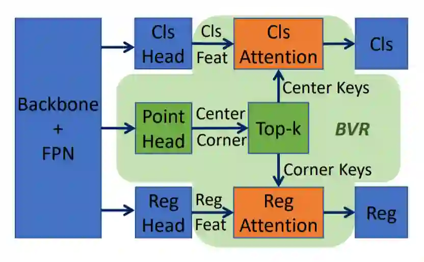 RetinaNet 中,在基于矩形框的锚点表示分支的基础上,额外增加了关于点的预测的头部网络分支,用于预测中心点(center)和角点(corner),并作为主分支的辅助表示(auxiliary representation)。在建模主表示和辅助表示间关系时,需同时考虑表观间的关系,如果将所有的中心点/角点都作为查询输入的话,将会带来极大的计算复杂度。因此,研究员们提出了只利用得分 top-k 的查询选择策略来降低运算、提升效果,并且利用空间域插值的方式来计算几何关系,进一步降低运算代价。关于如何将 BVR 插入到 FCOS、Faster R-CNN 以及 FOCS 中,请阅读原论文进行了解。