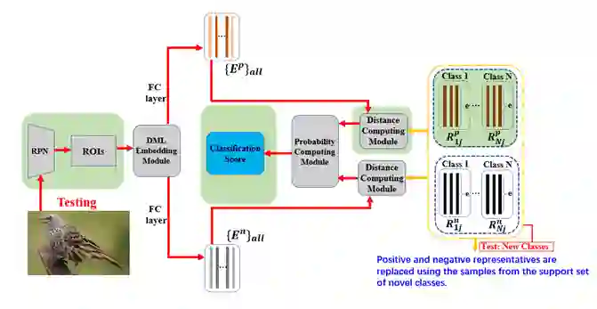 小样本类别的测试过程如图7所示。首先利用有标签支持集上的样本,通过 DML Embedding Module 后全连接层提取到的特征,根据 IoU 进行小样本类别正样本表示和负样本表示的替换。对于查询集(query set)上的测试数据,其计算过程如上图红色箭头所示,与训练过程相同。
