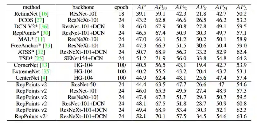 表2展示了在不同的主干(backbone)网络下,该方法相比于 RepPoints v1 均能够获得2%左右的稳定提升。表3则比较了本文提出的检测器与其他检测器之间的性能。