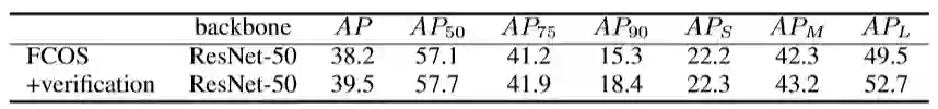 下面两个表格展示了在其它基检测器以及实例分割任务上本文方法的适用性。表4:在 mmdetection 集合上,验证模块用于 FCOS 方法的实验结果