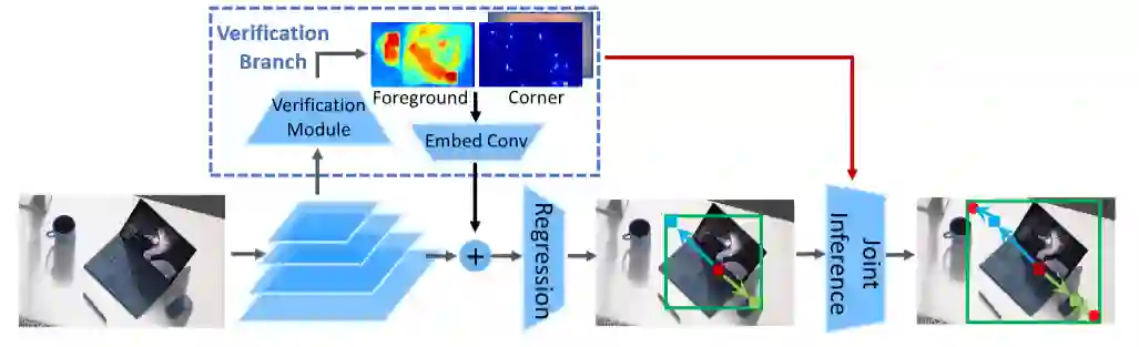 其次是联合推断:在特征层面的融合之外,验证分支中的角点验证模块可以对回归分支的结果进行进一步的修正,获得更为精确的结果。
