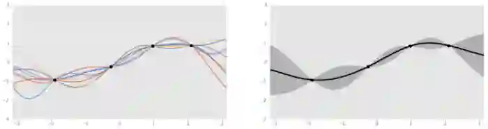左图:基于 4 个数据点生成的几个基于高斯过程的函数;右图:将这些函数聚合之后。