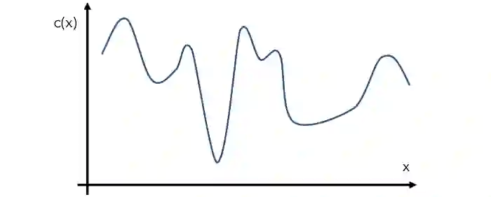我们来构建一个假设的示例函数 c(x),即一个模型在给定输入 x 下的成本。当然,这个函数的实际情况对优化器来说是未知的。假设 c(x) 的实际形状如下:这就是所谓的「目标函数」。