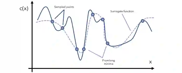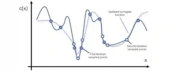 在每一次迭代中,我们都要继续观察当前的代理函数,通过采样对相关区域有更多了解,然后更新函数。注意,代理函数可表示成评估成本低得多的数学形式(比如用 y=x 近似表示一个成本更高的函数 y=arcsin((1-cos²x)/sin x) 的某个特定范围)。
