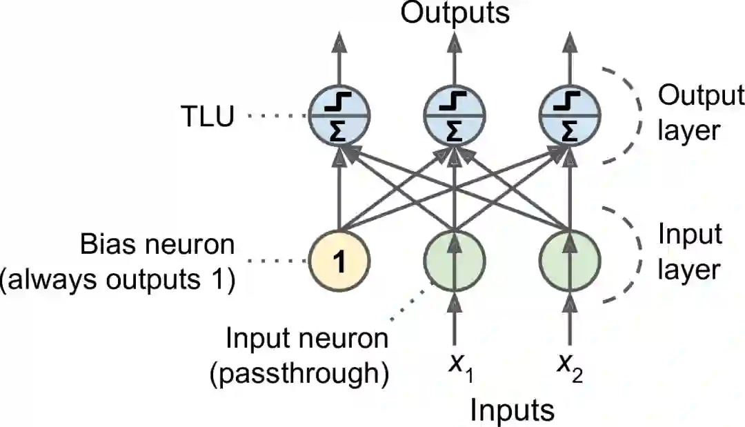 = 1 ):通常使用一种称为"偏置神经元"的特殊类型的神经元来表示该特征,该神经元始终输出1。具有两个输入和三个输出的感知器如图5所示。该感知器可以将实例同时分为三个不同的二进制类,这使其成为多输出分类器。