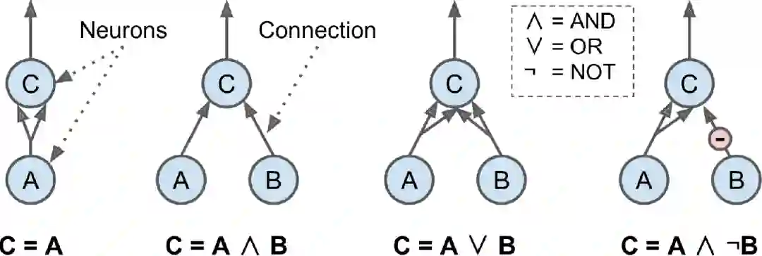 最后,如果我们假设输入连接可以抑制神经元的活动 ( 生物神经元就是这种情况 ),则第四网络计算出一个稍微复杂的逻辑命题:只有在神经元A处于活动状态和神经元B关闭时,神经元C才被激活。如果神经元A一直处于活动状态,那么你会得到逻辑非:神经元B关闭时神经元C处于活动状态,反之亦然。