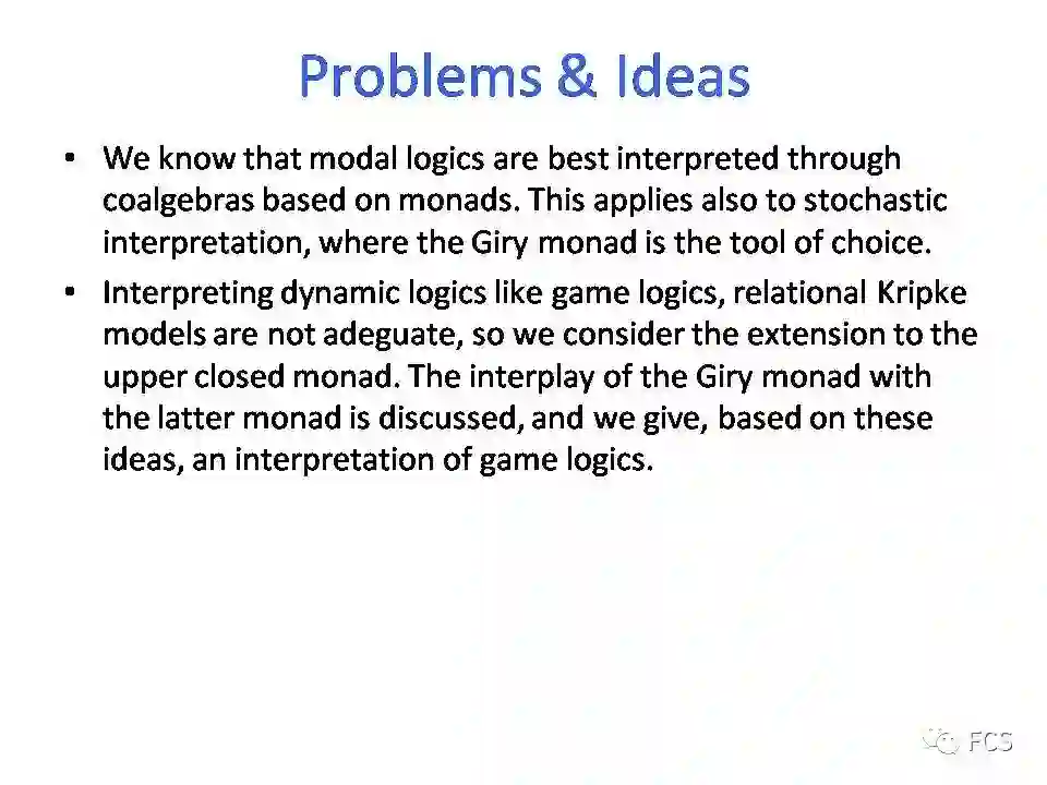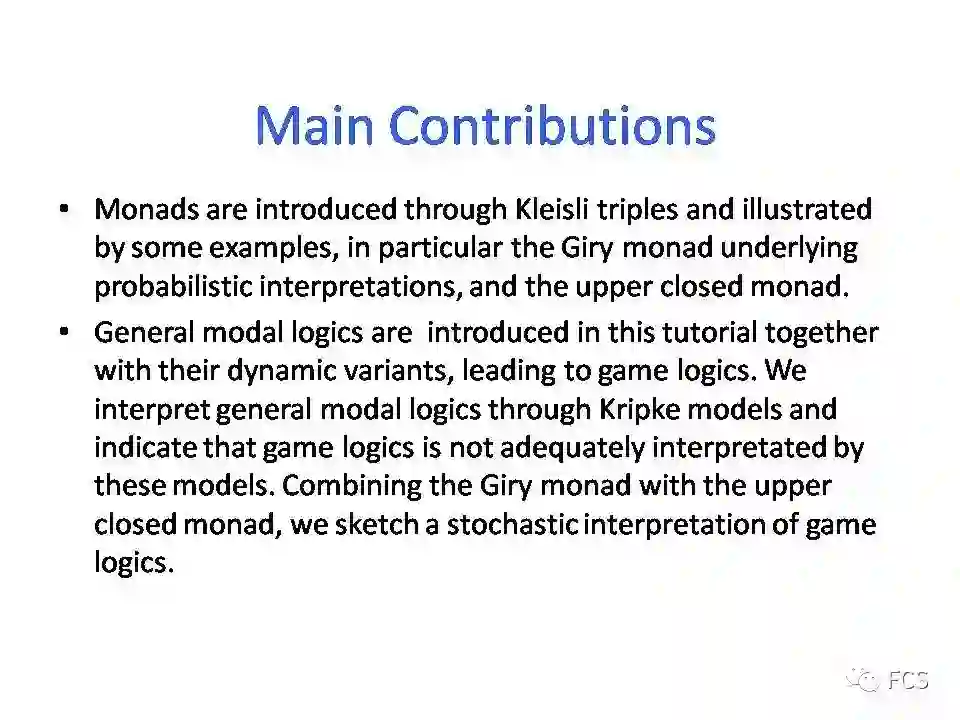 Parikh 博弈逻辑的随机解释不应遵循基于Giry单子Kleisli 态射的Kripke模型的一般模式,而是需要一种具体的、更普通的概率非确定性方法。本文概述了这种方法及其概率和度量理论基础,介绍了Giry单子和它的Kleisli态射,及其控制技术。文章给出了建立具体技术的证明,提供了现存文献的指示信息。通过学习本教程,能够更容易理解相关领域的原始文献、以及Markov过渡系统领域的研究工作理论论证和随机有效性函数。