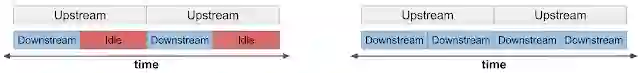 左:未使用数据回送,下游计算能力闲置率达 50%;右:使用回送因子为 2 的数据回送,利用下游计算能力