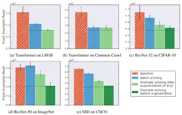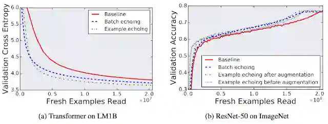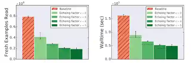 假定读取并预处理一批训练数据的时间是对其执行一次优化步骤所需时间的两倍。在这种情况下,对这批预处理数据执行首次优化步骤后,我们可以在下一批数据准备就绪之前重用这批数据再次执行一次优化步骤。在最佳情况下,如果重复的数据与新数据一样有用,那么训练速度会提高一倍。实际上,由于重复的数据不如新数据有用,数据回送的提速影响力略小一些,但与加速器闲置相比,此技术仍可显著提升训练速度。