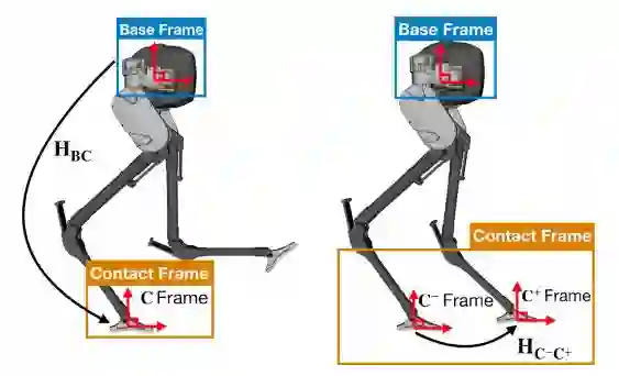 图2 上图展示了双足机器人上如何计算两个接触帧之间的转换关系的方法,即以基础帧为基础,然后计算两个接触帧间的单应矩阵。