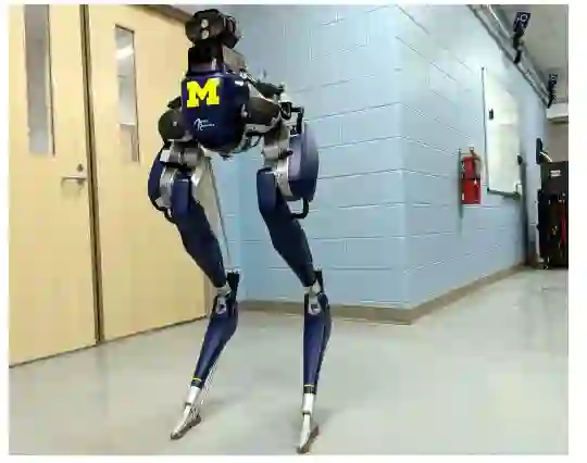 图1 本文使用机器人,其是由Agility Robotics生产的Cassie-Series双足机器人,其具有20个自由度、10个执行器、联合编码器、IMU和一个S7双目相机。