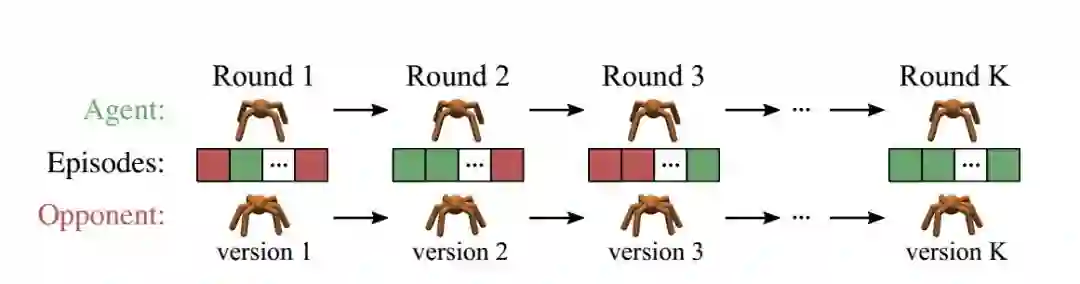 下图表示在一轮包含多局的迭代适应游戏中,一个agent与其对手竞争。如果它在一轮中赢了多局(用颜色来表明胜败),那么它就赢了一局。agent和他们的对手可以在不断地改变策略。