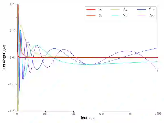 滤波器幅值与时间关系图中描绘的一组滤波器。借助频谱滤波技术,我们可以使用多个滤波器预测给定时间的线性动态系统状态。每个滤波器都是一组权重,用于总结过去的观察值,这样就可以以加权方式将它们组合起来,随着时间的推移,我们可以更准确地预测系统