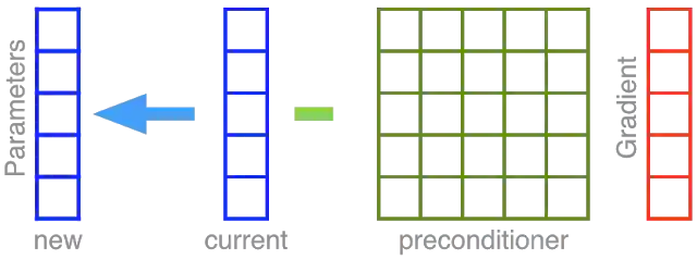 此方法旨在改变优化目标景观的几何结构,从而使梯度下降法更容易发挥作用。为此,我们采用预处理方法拉伸和旋转空间。经过预处理的地形看起来仿佛右上方图片中平静的湖面,是一个近乎完美的球形,而下降轨迹则是一条直线!从程序上来看,相比于从参数向量本身去除梯度向量,自适应预处理首先通过一个名为矩阵预处理器的 5×5 多单元格结构增加梯度,如下图所示。