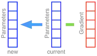 梯度下降 (GD) 及其随机版本随机梯度下降 (SGD) 是用于优化神经网络权重的选择法。通过将全部参数堆叠在一起,形成一组组合成向量的单元格。我们简单观察一下,然后假设我们的神经网络只有 5 个不同的参数。采取梯度下降步骤意味着从当前参数组(蓝色)中去除梯度向量(红色),并将结果放回到参数向量中。
