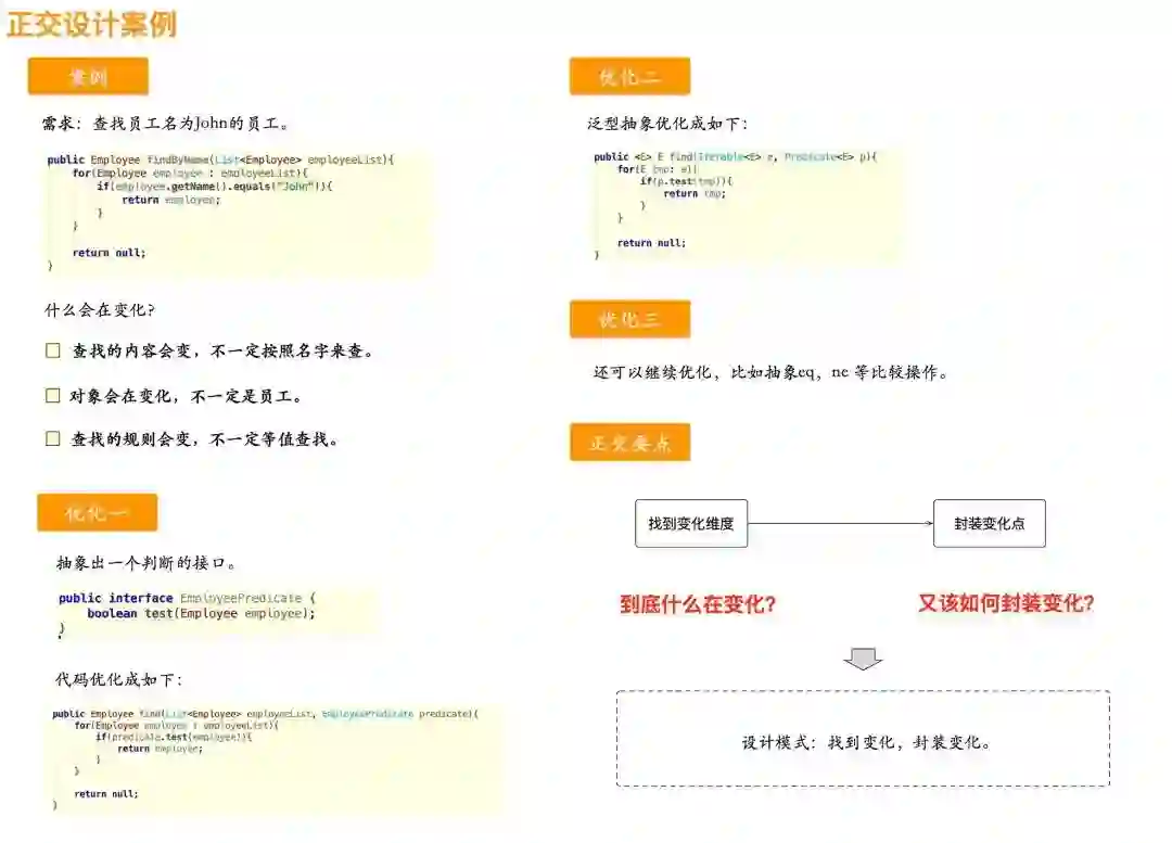 举一个正交的例子,假如有一个需求是:查找员工名为John的员工,这个代码可以很快写出来,但细细想想的它的变化点,至少可以想到下面3个变化点: