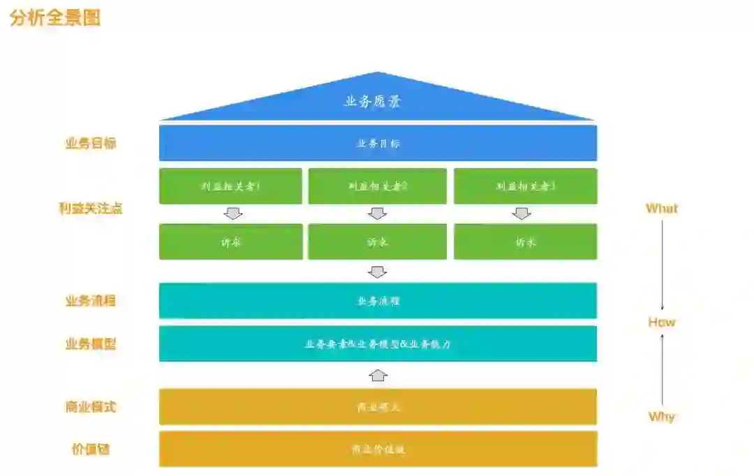 分析往上看一层,就是要分析商业价值链和商业模式,虽然这一块并不是开发同学负责的范畴,了解一些还比较好,能让我们对业务有更深刻的认识,商业模式决定商业结构,商业结构决定交易结构,交易结构决定业务组成结构。利益相关者也是从业务组成结构中推导出来的,这一部分是最顶层的分析,分析业务的可行性,也即我们常说的Why。
