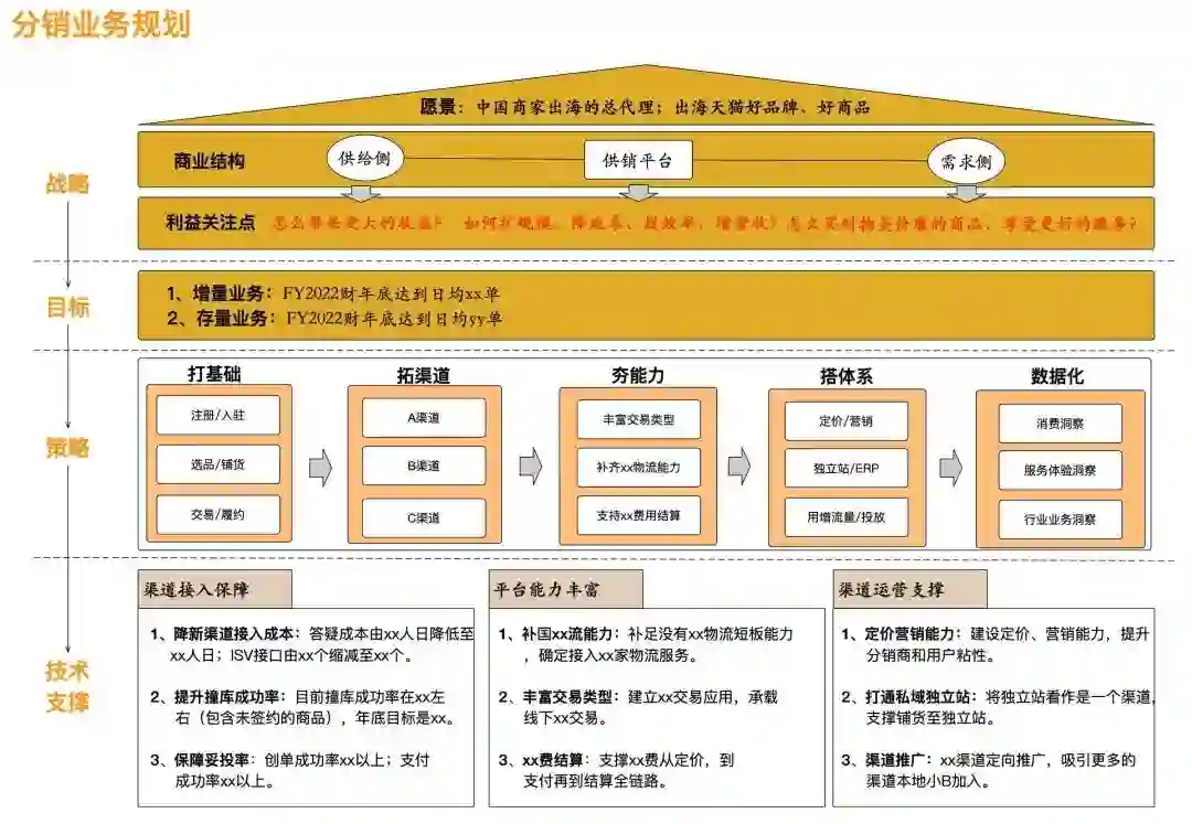 用2.1节中提到的分析方法,我当时分析一个分销业务也是用了上面的方法,从下面这张图中可以看出业务发展思路是怎样,用了几个关键词进行概括:打基础、拓渠道、夯能力、搭体系、数据化。当有了这些认识之后,再去推导技术侧要做哪些就比较容易,以拓展渠道为例,当多个渠道接入进来时就暴露了一些问题,比如答疑成本比较高,因此就有一个重要的方面就是渠道接入保障,怎么减少渠道接入成本、答疑成本就是技术侧要思考的问题。