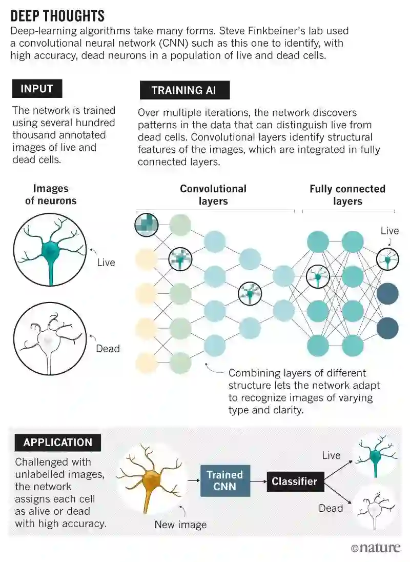 Finkbeiner的成功凸显了深度学习这一人工智能(AI)最有前途的分支之一正在大步迈入生物学领域。算法以人类无法做到的方式潜入数据中,捕获人类可能忽略的特征。研究人员正在使用这些算法对细胞图像进行分类,建立基因组连接,加速药物发现周期,甚至还能将基因数据、成像数据和电子病历这些不同类型的数据联系起来。