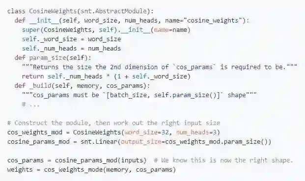 除了可变共享之外,在我们希望将配置参数附加到操作系统的情况下,使用Sonnet模块可以很方便。一个例子是[content addressing](可微分神经计算机中的模块),这些模块接收多个配置参数(内存中的每个单词的大小,读写头的数量),这些输入的一些功能定义了有效输入。我们在这个模块之前使用正确输出大小的snt.Linear来提供正确的维度。由于是一个模块,实现起来很容易——在构建时提供configuration,然后提供一个method.param_size(),它给出所需输入的维数。然后我们就能得到正确的输入张量大小并进行连接。