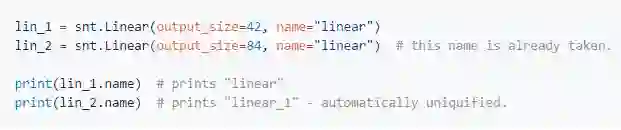 答:似乎以相同名称构造的模块将具有不同的名称和可变 scope。在内部,Sonnet 使用tf.make_template,它基本上是与一些 tf.VariableScope 一起包装了一个python函数,来确保对该函数的每次调用都发生在同一个 scope 内,并且第一个调用之后的所有调用都设置为重用变量。模板的一个特点是,如果已经在同一 scope 内输入了任何名称,它将使其唯一化。例如:
