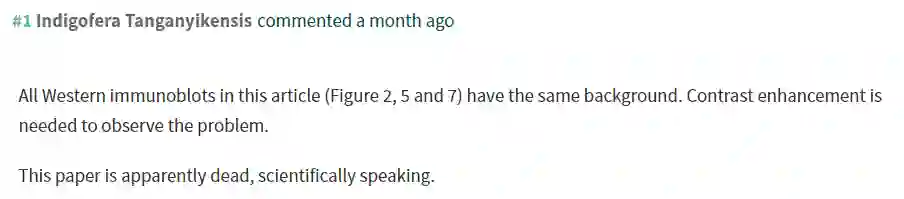 1、蛋白质印迹条背景高度相似。这一点最早由化名为Indigofera Tanganyikensis的网友在同行评议网站上指出。