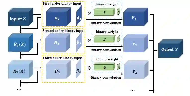 之前的二值化方法,例如XNOR,对输入简单地采用了阈值量化的操作。这样的方法可以看成是对浮点数的一阶二值近似方法。在此之上,本文运用递归阈值量化的方法,提出了HORQ的框架。具体来讲,如图一所示,在第一次阈值量化操作后,我们可以定义并计算改阶近似对应的残差,然后对该阶残差进行新一轮的二值近似。通过对高阶残差的近似,我们可以得到对应于不同尺度下的二值feature map。将这些feature map相加,便可得到最终的输出。