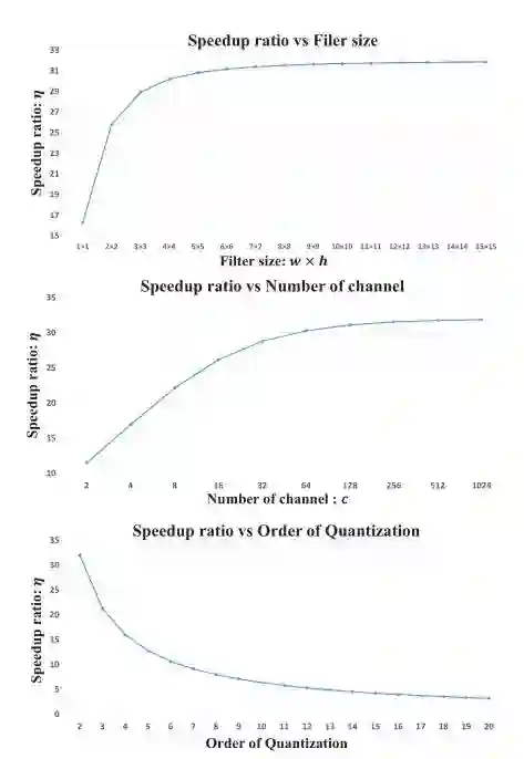 HORQ方法对卷积层计算的的加速比跟卷积核大小,feature map数量,以及残差量化的阶数都有较大关系。这些关系体现在图四和图五中。而且,如图六所示,基于二值化的模型存储空间可以得到大幅度的降低。