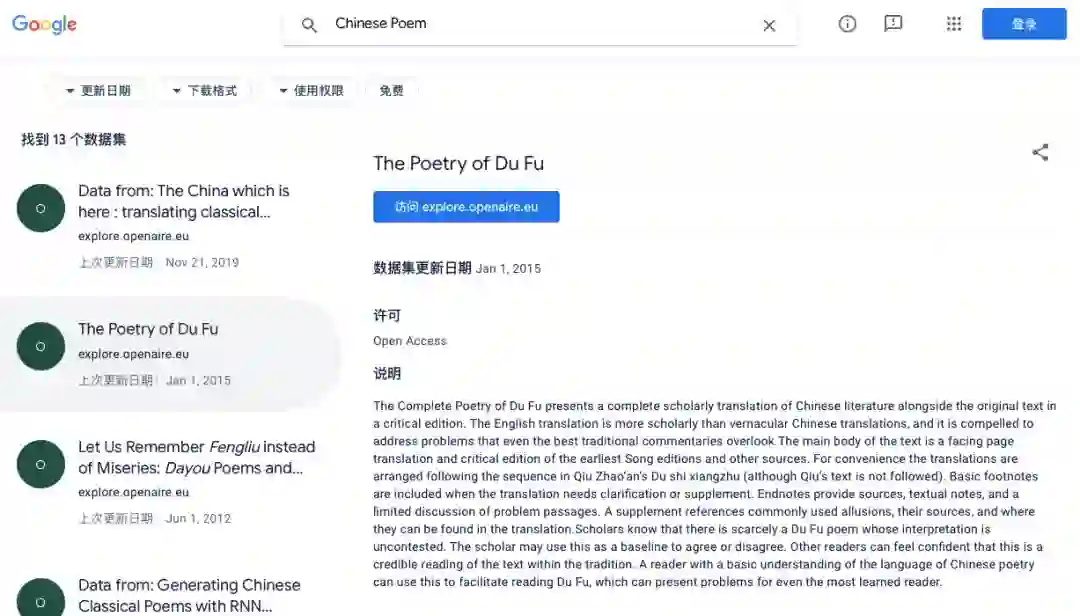 如果我们不知道数据集叫什么名字,但是想看看有没有某种数据的数据集呢?机器之心尝试了一些不常用关键词,如「Chinese Poem」(中国诗歌)。